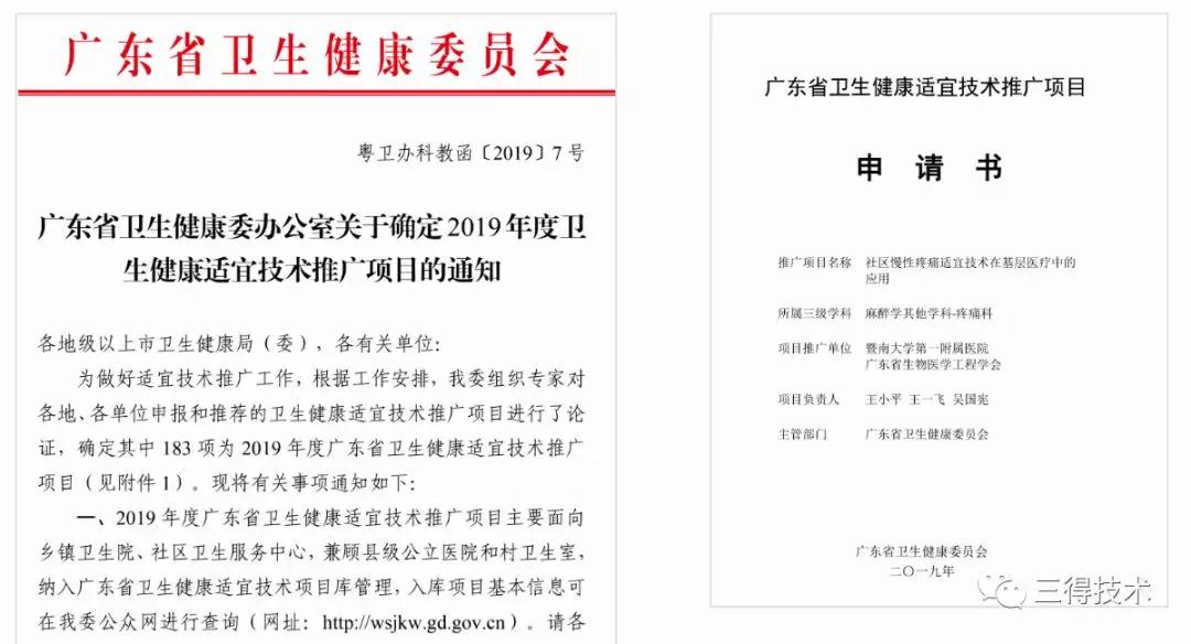 早在今年的2019年8月27日,由暨南大學(xué)第一附屬醫(yī)院和廣東省生物醫(yī)學(xué)工程學(xué)會牽頭,王小平、王一飛、吳國憲三位專家聯(lián)合共同申報的《社區(qū)慢性疼痛適宜技術(shù)在基層醫(yī)療中的應(yīng)用》項目,通過廣東省衛(wèi)生健康委員會論證,確定(183項)為2019廣東省衛(wèi)生健康適宜技術(shù)推廣項目,“三得技術(shù)————仿生低頻電磁生物傳導(dǎo)技術(shù)”也列入其中,為深入基層奠定了更加夯實的基礎(chǔ)。