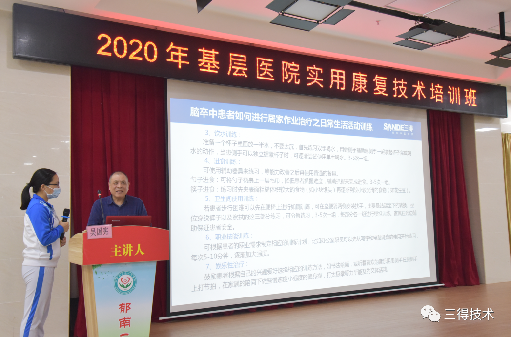 基層醫(yī)療在慢病康復治療方面進展緩慢,特別是像中風(腦卒中)這樣可導致肢體癱瘓、語言障礙、吞咽困難、認知障礙、精神抑郁等,具有發(fā)病率高、復發(fā)率高、致殘率高和死亡率高及經(jīng)濟負擔重,影響我國群眾健康的重大疾病,一般都束手無策,很多家庭也因此返貧。此次培訓,吳院長以“三得技術”治療中風后遺癥康復新進展為課題,希望通過培訓,基層醫(yī)生在面對中風康復治療時能夠有更多更好的選擇,減少中風對家庭的傷害,降低中風致死率、致殘率,同時提升基層醫(yī)療中風中醫(yī)康復適宜技術能力。